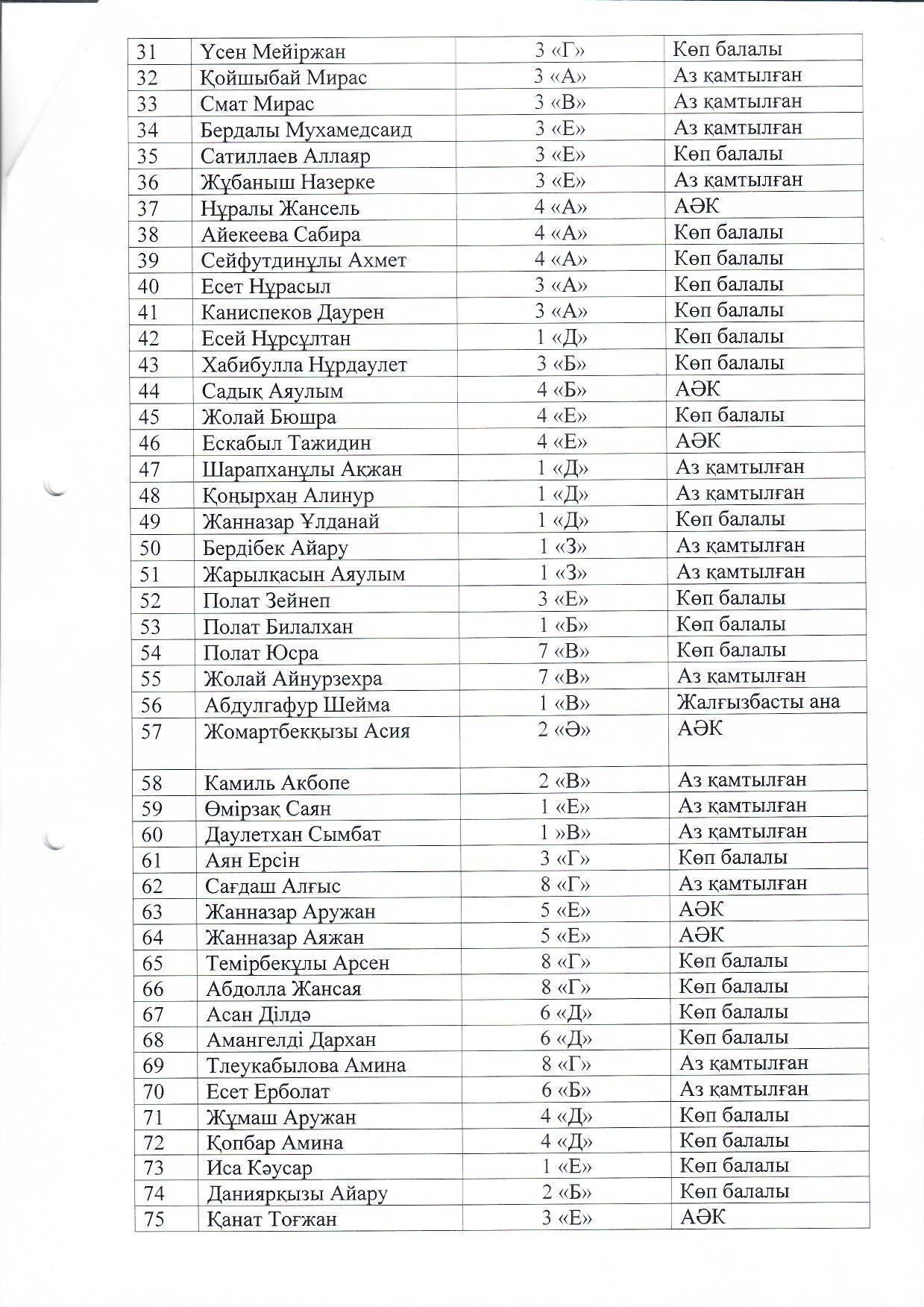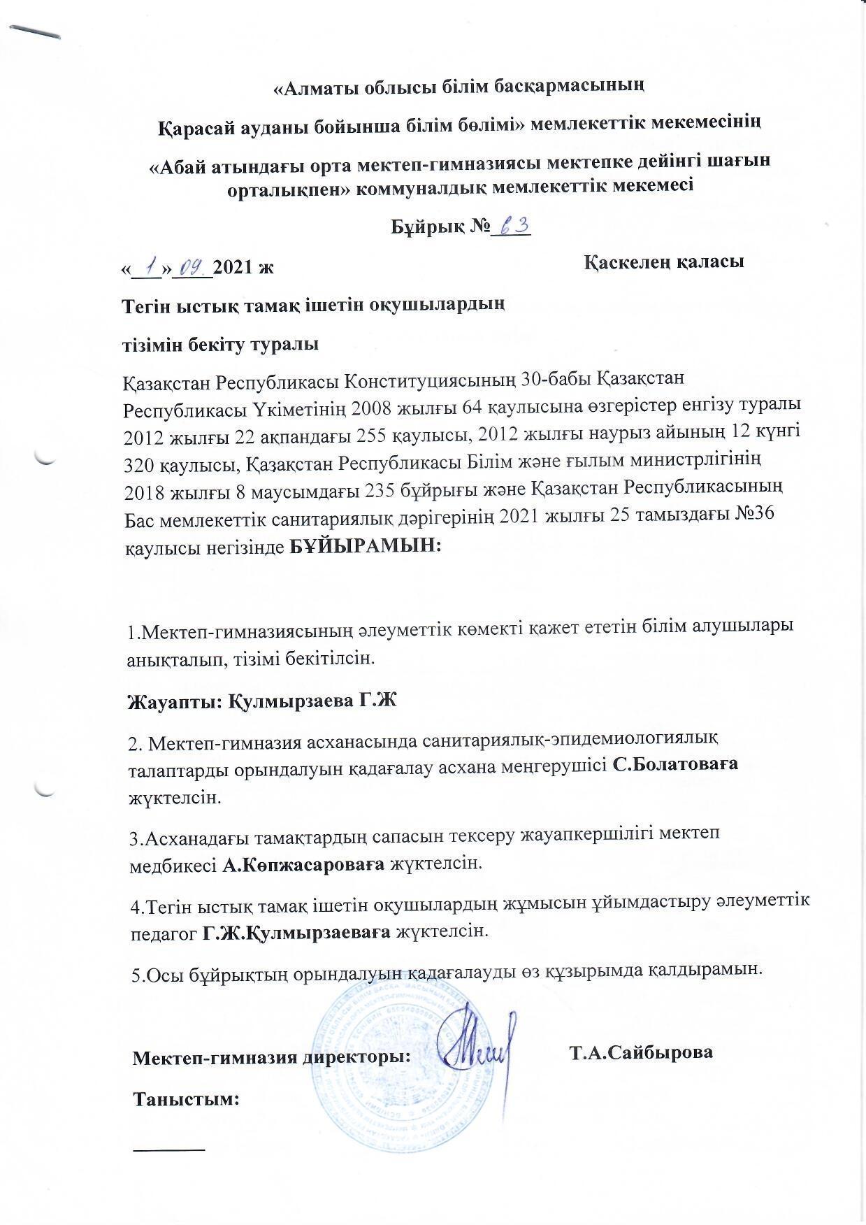 01 сентябрь 2021 0 1 2 3 4 5 Мектеп -гимназия бойынша тегін ыстық тамақпен қамтамасыз етілген оқушылар тізімі Мектеп -гимназия бойынша тегін ыстық тамақ ішетін оқушылардың тізімін бекіту туралы бұйрығы және оқушылардың тізімі
